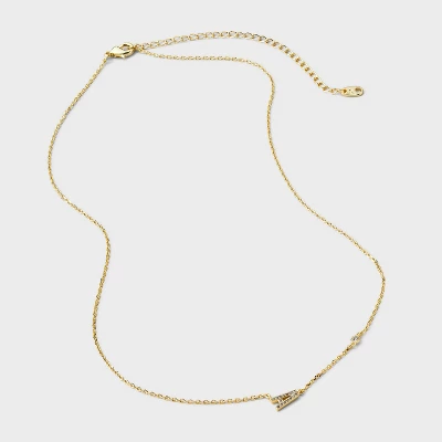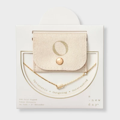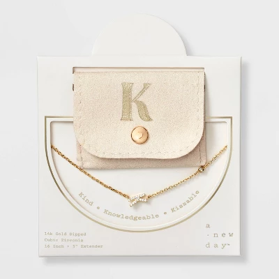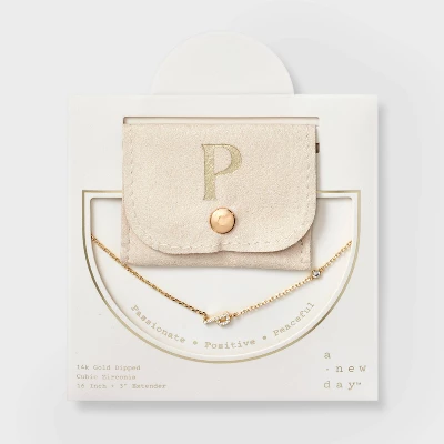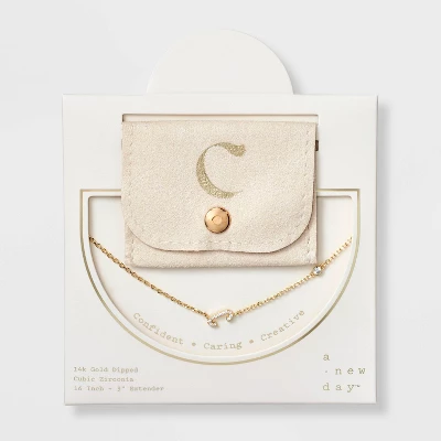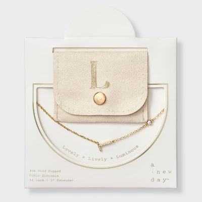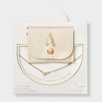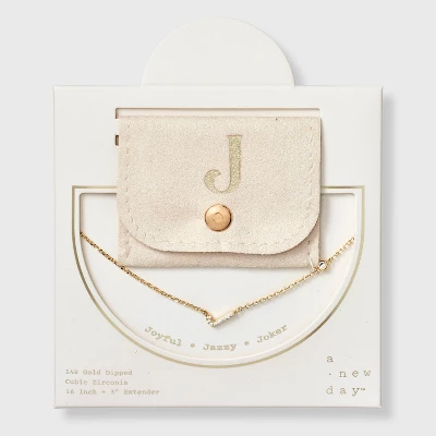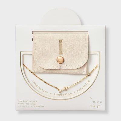 Add a touch of bling to any outfit with this 14K Gold-Dipped Cubic Zirconia Initial Necklace from A New Day™. Dipped in 14K gold, this necklace features a chain with a cubic zirconia stone and an initial charm studded with cubic zirconia for a dazzling look. Made of brass, this necklace is designed with a lobster claw clasp closure for a snug fit. Plus, it features a 16-inch chain and a 3-inch extender to adjust the length to your liking. The included gift box makes it an ideal present for your loved ones.