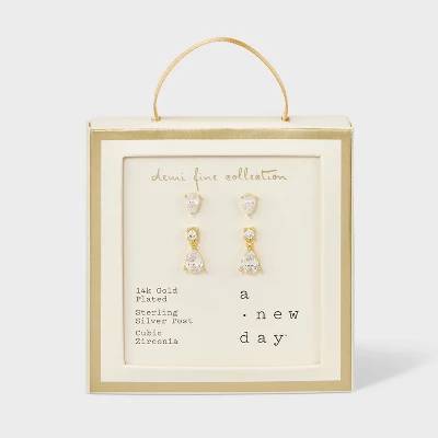 Present a beautiful gift to a loved one with the 14K Gold Plated Cubic Zirconia Teardrop and Dangle Stud Earring Set from A New Day™. The set of stud earrings includes one pair in a teardrop shape and one pair with a dangle design for accessorizing options. Designed with nickel-free metal, these gold-plated earrings suit most skin types, and offer a secure fit with the post-back closures.