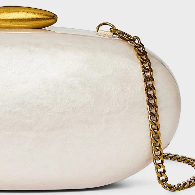 Upgrade your accessory collection with this Organic Minaudiere Clutch from A New Day™. This clutch bag features an oval shape in pearl and golden hues for a standout look. It has a single main compartment to keep cards and other small items organized, and a snap closure helps keep the contents secured yet close at hand. Designed with a removable chain strap handle, it’s easy to carry with you wherever you go.