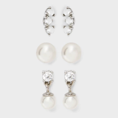 Get ready for the evening in glam style by accessorizing your ears with the pieces from the Sterling Silver Pearl Dangle Stud Earring Set from A New Day™. This silver-tone earring set includes round faux pearl, dangling stones and more with cubic zirconia accents for stylish accessorizing options. Made of nickel-free metal to suit most skin types, these earrings have postback closures for a snug fit in your ears.