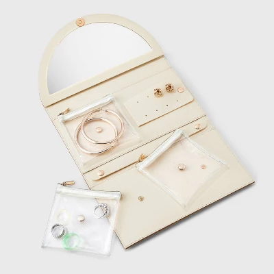 Update your travel necessities in chic style with this Textured Lemon Travel Folio with Mirror from A New Day™. This travel folio organizer comes with zippered plastic bags and multiple notch pockets to help keep earrings and other accessories neatly organized and close at hand, while the built-in mirror makes getting ready easy. Designed with a snap closure, this textured lemon folio is the perfect travel companion.