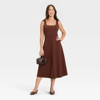 Stay comfy and stylish at the office, weekend brunches and more with this Ponte Knit Midi Dress from A New Day™. The sleeveless knit dress is made of a mix of rayon, nylon and spandex fabric with recycled polyester-spandex lining for comfortable wear. The sleeveless dress is designed with a double-stitched seam for a flowy look, while a square neckline ensures ease of wear. Pair it with sneakers or sandals to complete the look.