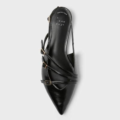 Add a touch of sophisticated charm to your outfit with these Twiggy Multi Buckle Mini Heel Flats from A New Day™. These twiggy flats feature multiple straps on the vamp with buckle closure that helps provide a snug fit and accentuate your feet. The one-inch block heel elevates the look, while the cushioned insole offers better arch support for extra comfort. Designed with a closed pointed toe for a polished appearance, these medium-width flats offers easy transition from casual brunches to fancy dinners.
