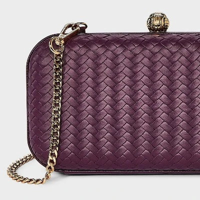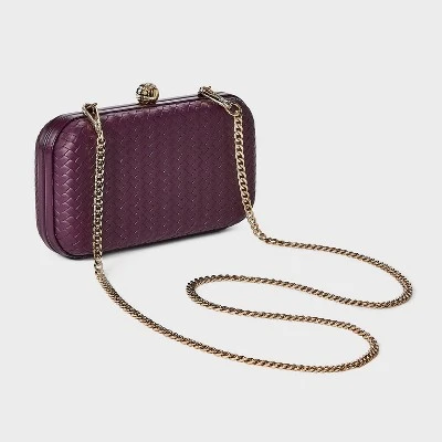Finish off your casual or dressier looks with this Woven Minaudiere Clutch Crossbody Bag from A New Day™. This clutch is made with polyurethane fabric with an allover woven pattern for a standout look. It features a single main compartment to keep cards and other small items organized, and a latch closure helps keep the contents secured yet close at hand. Plus, you can carry it handheld or crossbody using the detachable, adjustable gold-tone chain strap.